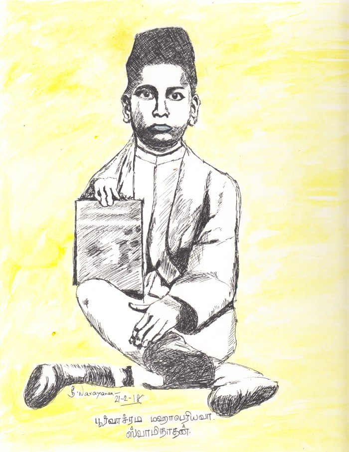 Sankaracharya Swamikal, who is the Jagat Guru Sri Kanchi KamakOti PeetAthipathi, talked to the twelve year old child Swaminathan, taking a lot of interest. Not only on that day but on all of the two days Subramanya Sastrikal stayed in Perumookkal, calling Swaminathan very frequently to His quarters. We do not know for sure what sort of experiences child Swaminathan had during those meetings with the Peetathipathi.